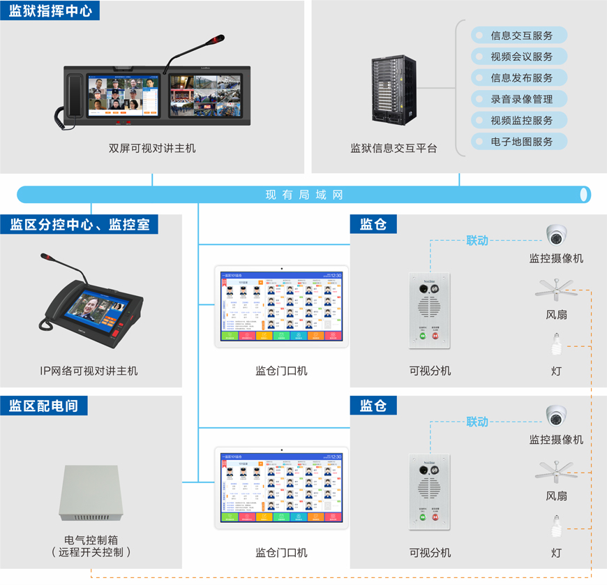 監(jiān)倉可視對講系統(tǒng)基于IP網(wǎng)絡架構(gòu)(可跨網(wǎng)段跨路由),以監(jiān)倉信息交互為核心,可實現(xiàn)信息展示、信息查詢、信息采集、信息統(tǒng)計,并具有人像點名、可視對講、視頻會議、電氣控制等功能。